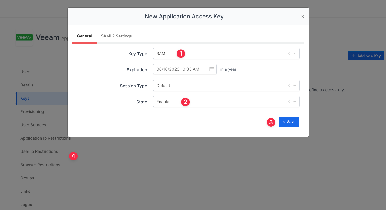 In the opened modal, choose SAML as Key Type and switch to SAML2 Settings.