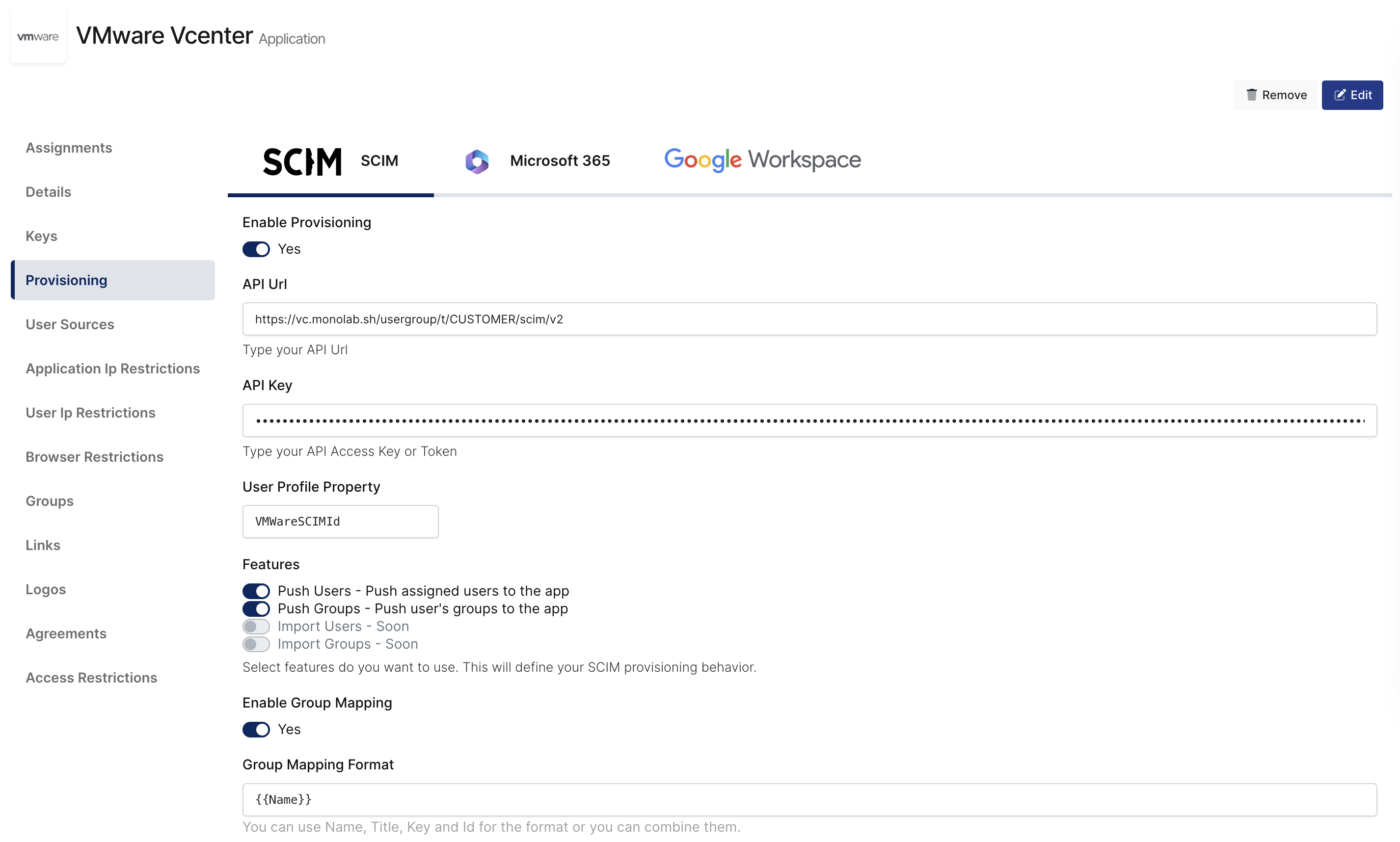 You also need to configure SCIM provider for your application. Click Provisioning and set your information.
