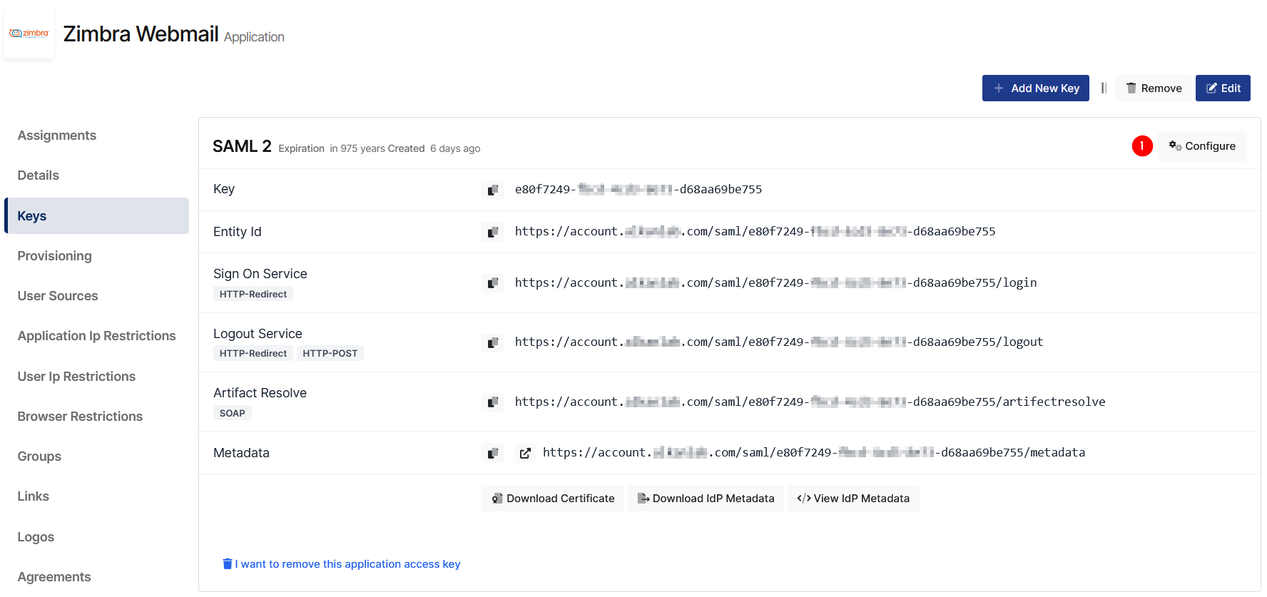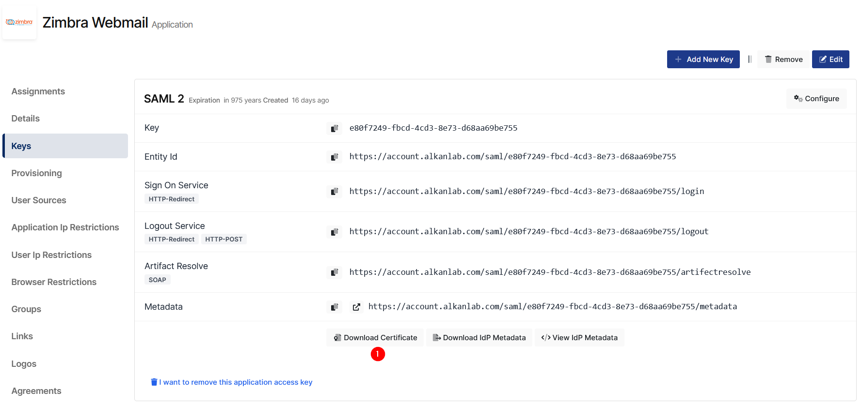 Create your application on Monosign and configure your access policy. Once you create, click “Keys” and add a new Access Key for SAML Key for access.