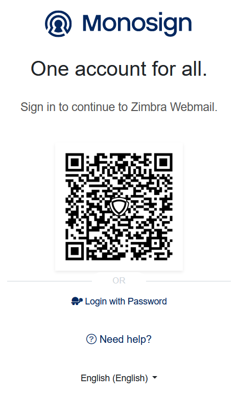 Login to Zimbra Webmail with Monosign Passwordless login or username/password option.