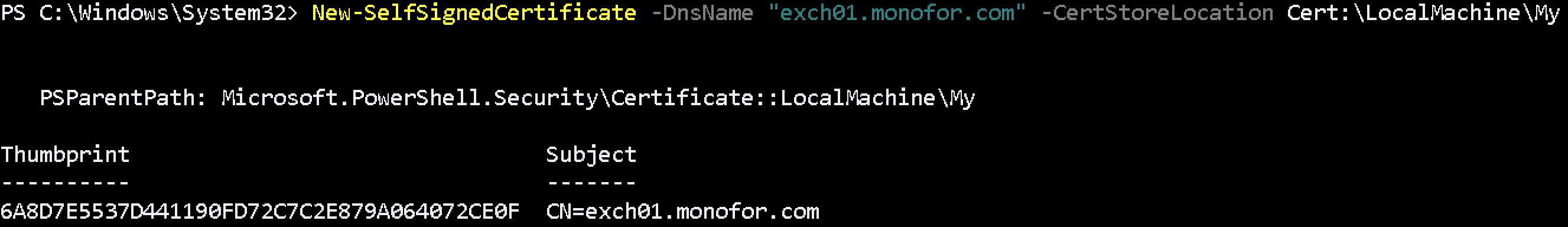 New-SelfSignedCertificate -DnsName "exch01.monofor.com" -CertStoreLocation Cert:\LocalMachine\My