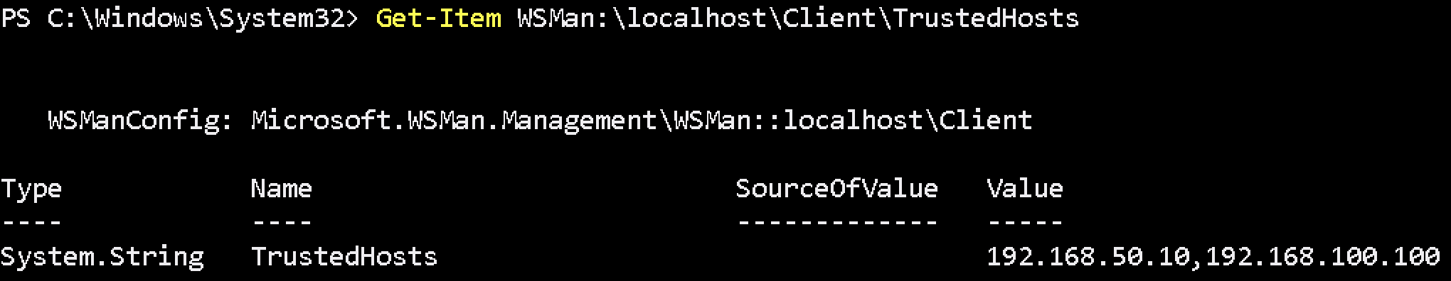 Set-Item WSMan:\localhost\Client\TrustedHosts -Value '192.168.50.10,192.168.100.100'