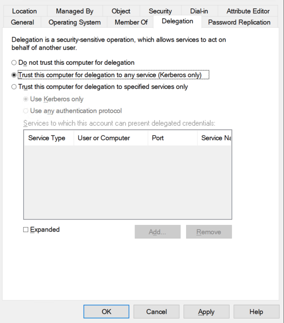 Properties → Delegation → Trust this computer for delegation to any service (Kerberos only)