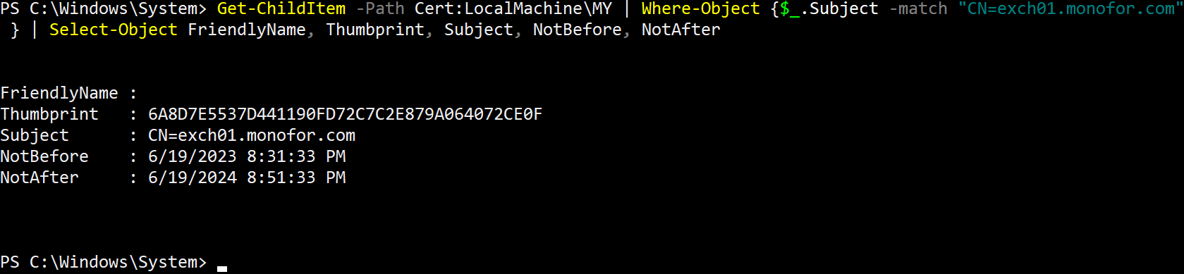 Get-ChildItem -Path Cert:LocalMachine\MY | Where-Object {$_.Subject -match "CN=exch01.monofor.com" } | Select-Object FriendlyName, Thumbprint, Subject, NotBefore, NotAfter