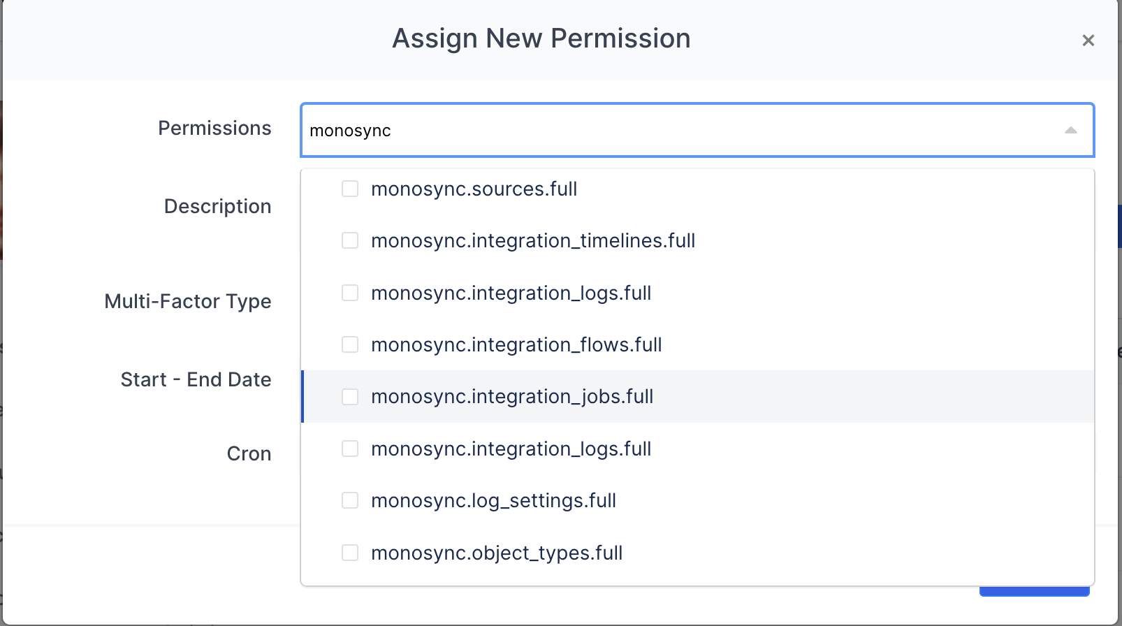 Choose your desired permissions for âMonoSyncâ app (all permissions related to MonoSync starts with prefix âmonosync.â) from âAssign New Permissionâ button.