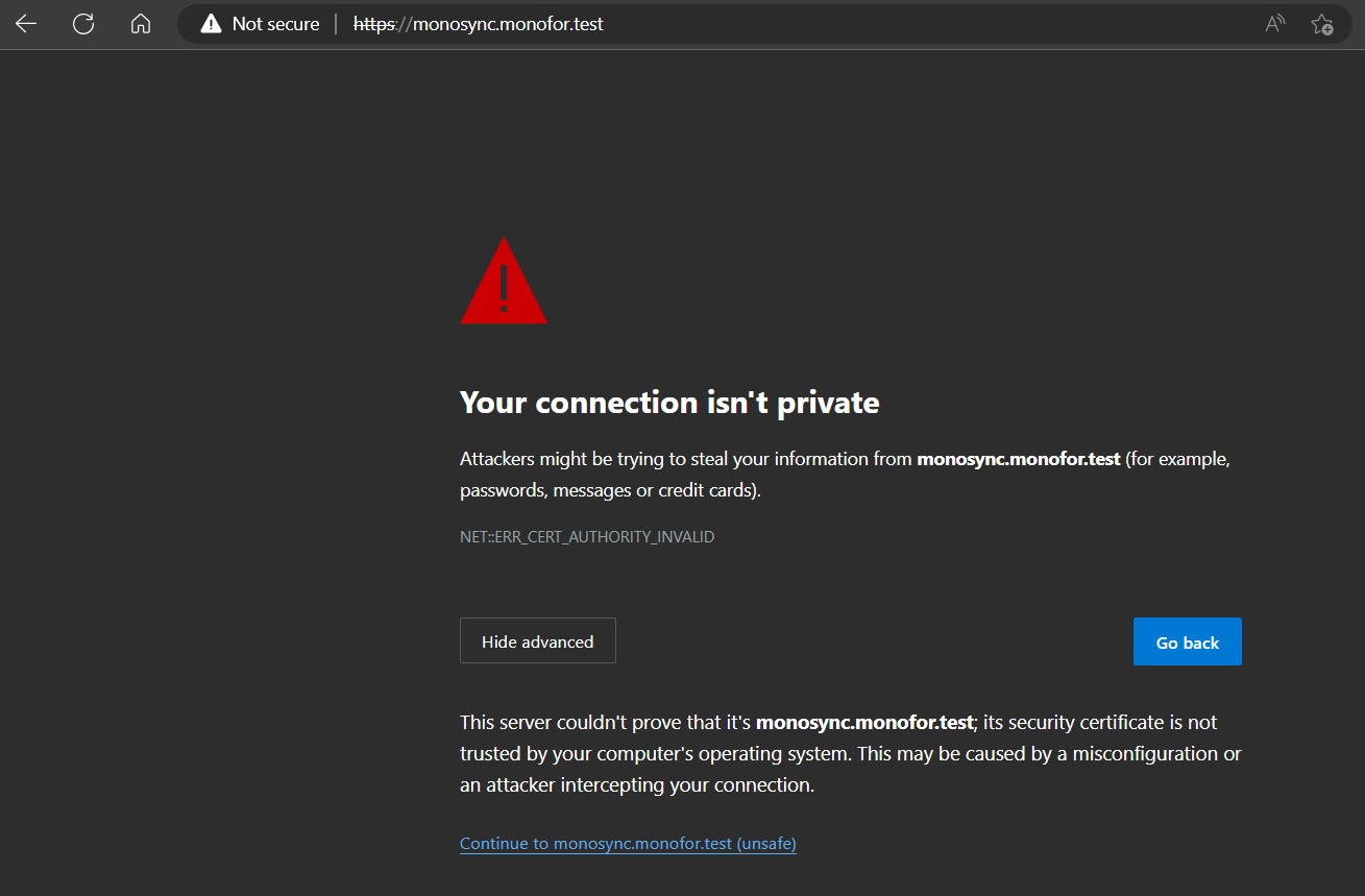 When typing monosync.monofor.test on your browser you will get the Privacy Error because Monosync being installed with Self-Signed SSL certificate.